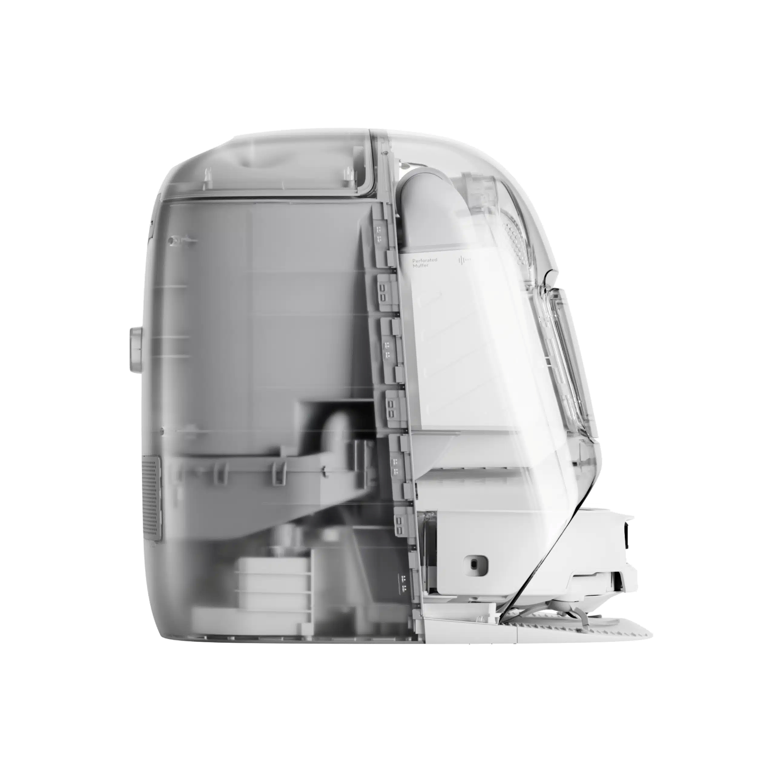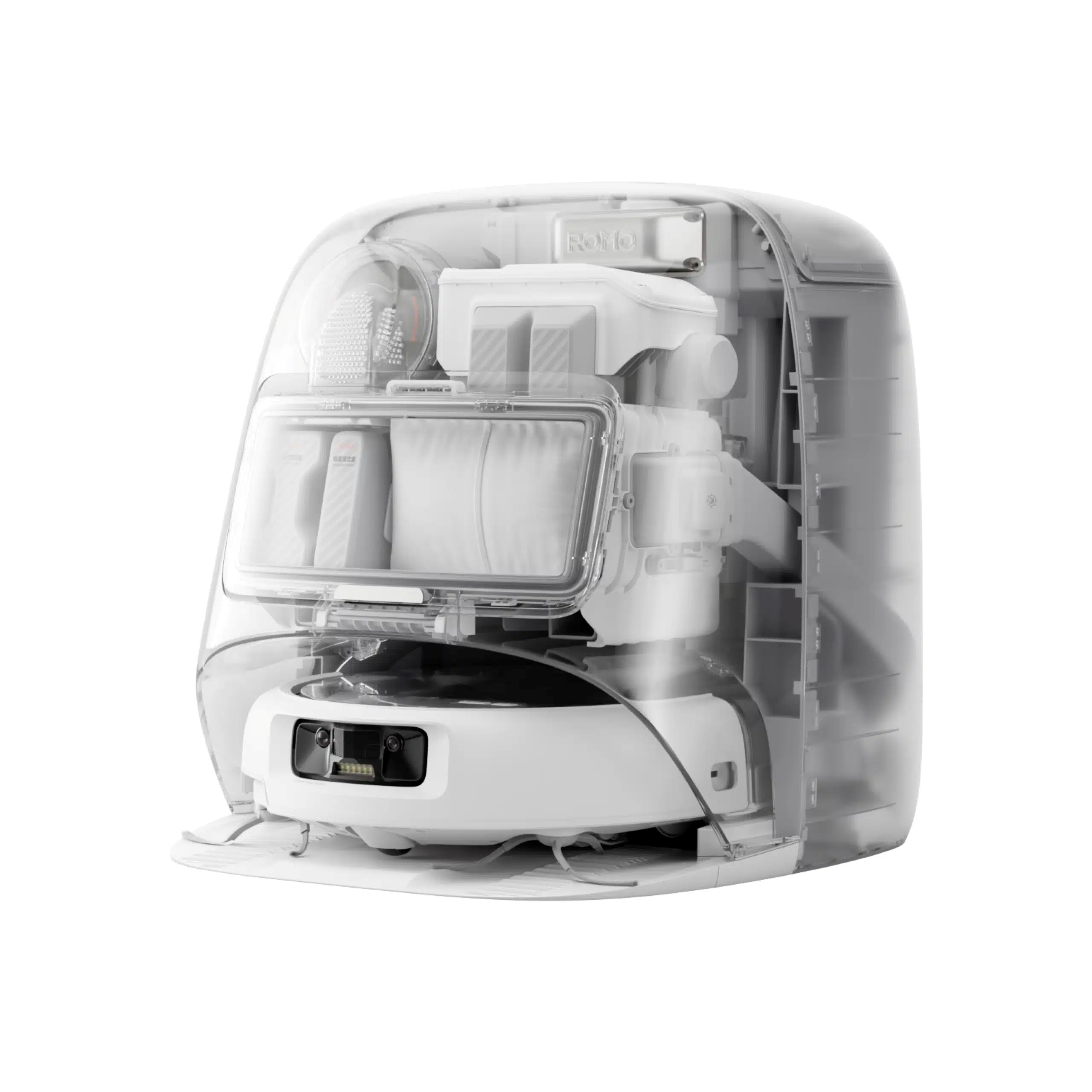 DJI Romo P gây ấn tượng mạnh với thân máy trong suốt hoàn toàn, cho phép nhìn thấy toàn bộ cấu trúc bên trong như motor, cảm biến và hệ thống cơ khí.
